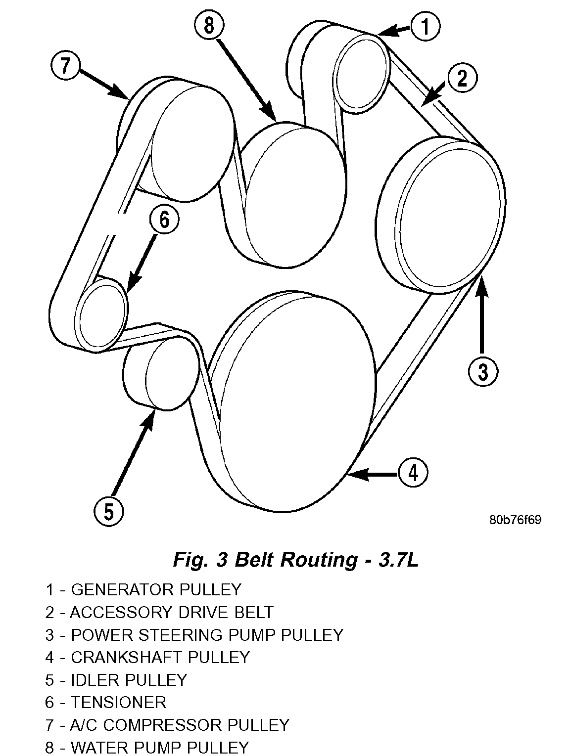 CAUTION: When installing the serpentine accessory drive belt, the belt MUST be routed correctly. If not, the engine may overheat due to the water pump rotating in the wrong direction (Fig. 3).