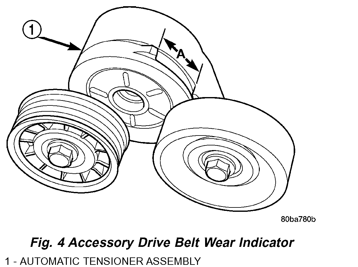 3. With the drive belt installed, inspect the belt wear indicator (Fig. 4). The gap between the tang and the housing stop ( measurement A ) must not exceed 24 mm (0.94 inches).