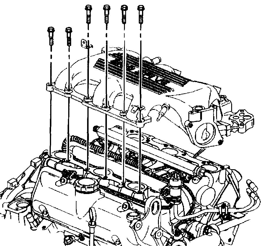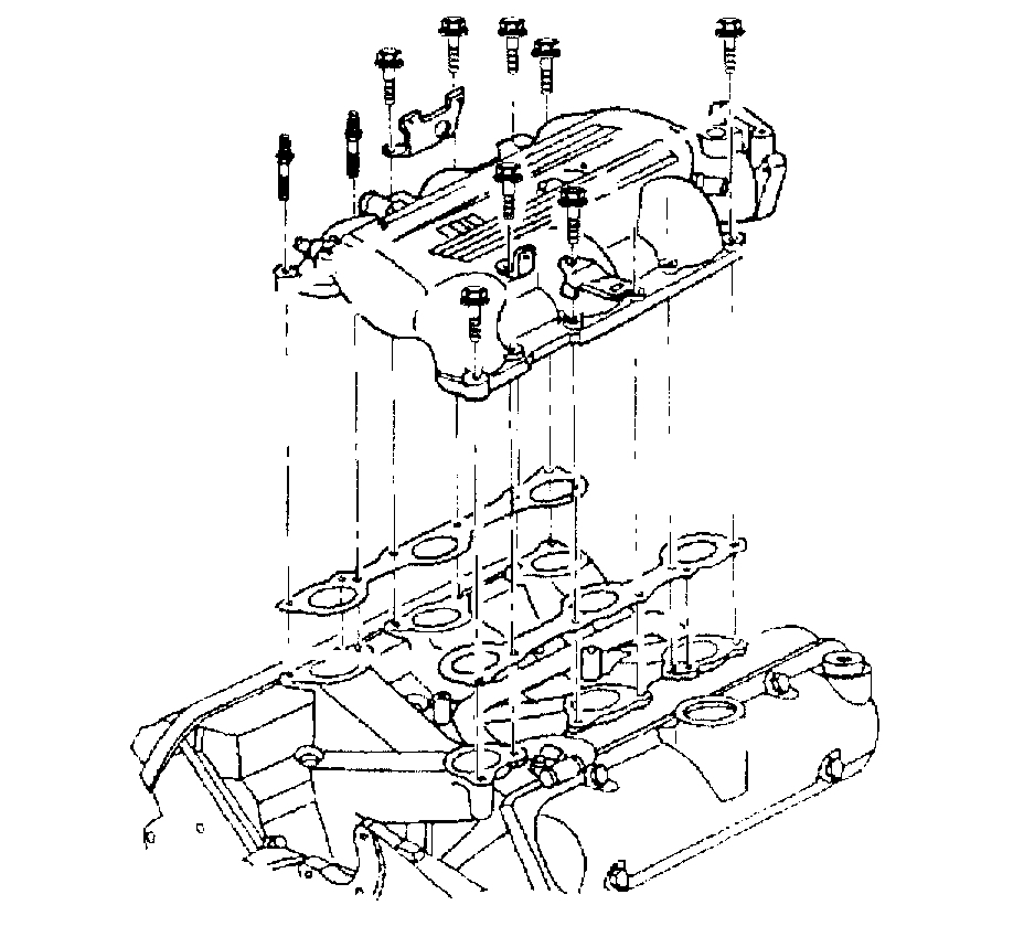 The torque specification is a 2-step process; tighten the vertical lower intake manifold bolts (the four middle ones) to 7 Nm (62 lb in). Tighten the diagonal lower intake manifold bolts (two on each end) to 7 Nm (62 lb in). Tighten the vertical lower intake manifold bolts (the four middle ones) to 13 Nm (115 lb in). Tighten the diagonal lower intake manifold bolts (two on each end) to 25 Nm (18 lb ft).