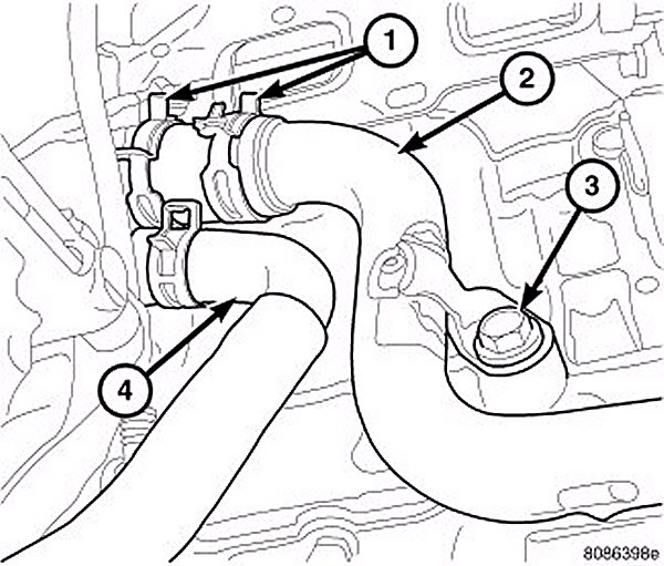 4. Install radiator hose tube (2) to thermostat and housing. Connect hose clamps (1) at thermostat housing. Install radiator hose tube mounting bolt (3).
