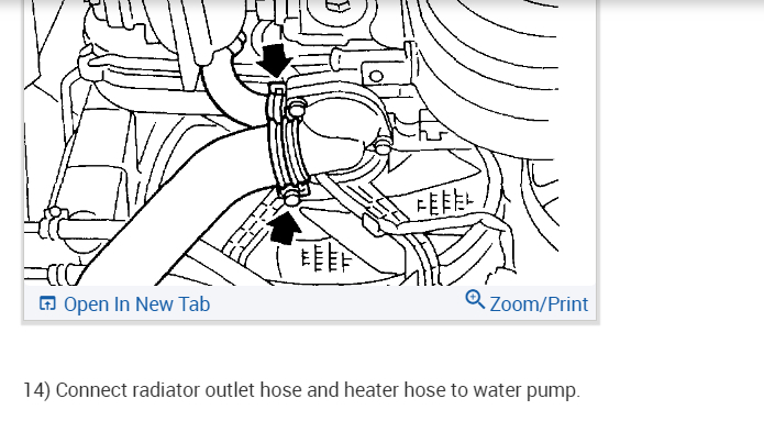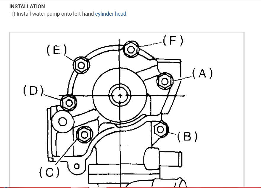 Water pump, tighten the bolts in sequence to 10 ft. lbs. (13 Nm). After tightening the bolts once, retighten to the same specification again.