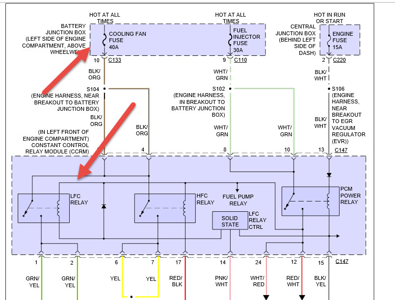 Check the two items in the picture. The relay may be internal to module if it is then it will need to be scanned for codes to see if its working. It cold be a bad coolant temperature sensor as well.