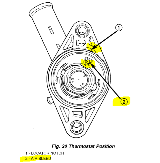 When you installed the new thermostat assembly, did you align the air bleed with the location notch on the outlet connector? See pic below.