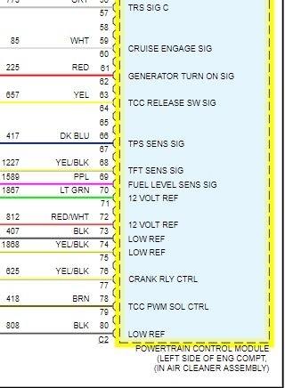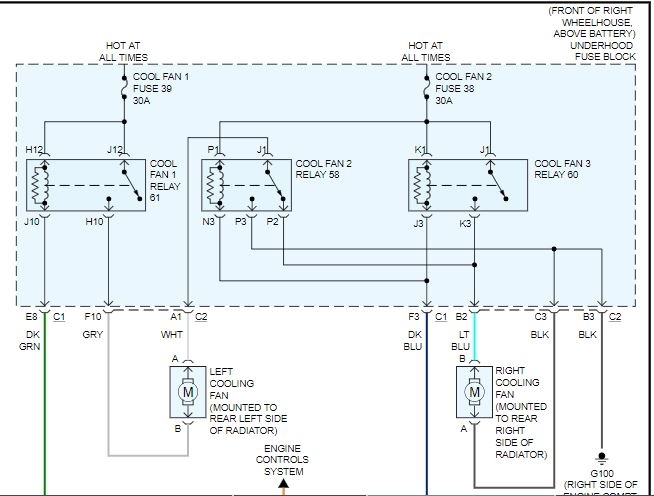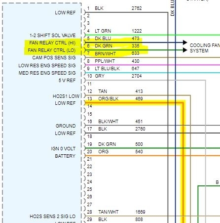Once we know power is making it all the way through the system to the low reference, then we have to check for power out to the fan relays. If you refer to the pics I attached first, you will see the pins and wire colors. Now, this has to be done when the engine is hot and the fans should be on, so be careful. If there is no power out going to the relays, suspect a bad PCM.