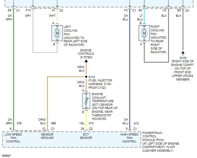 What is interesting to me is the fans are on low with the heater on. That shouldn't be unless you are running the defroster. Okay, I have attached several pics below related to the system. I start at the pcm / ect send signal. Voltage is to travel through the yellow wire to the ect. Based on engine temperature, resistance changes in the sensor and is allowed to travel to the low reference. From there, power is sent to the fan relays based on need. Interestingly, there is a splice in the wiring that I'm questioning. Also, the term "low reference" is referring to ground. What I need you to do is check for power first at the ect. If there is power, I need you to find the splice in the harness as indicated in the schematics and confirm there isn't an issue with corrosion or connection in any way. If it is good, then I need you to check continuity between the ect orange/black wire and where it plugs into the pcm.