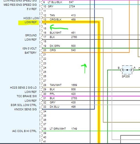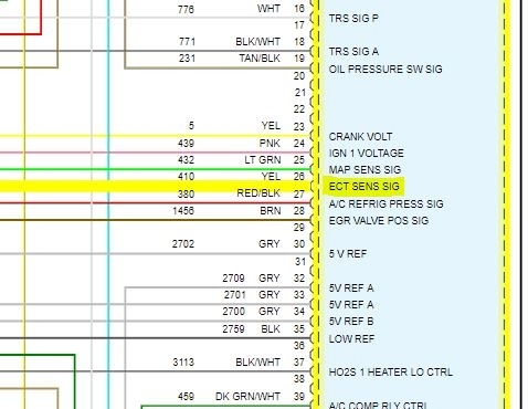 If that all checks, and there is power to the signal send to the yellow wire on the ect, then you need to disconnect the PCM, inspect the pin for low reference (orange / black wire) in the harness for corrosion or if it is pushed in and not making contact. If it is good, check continuity for ground at the low reference pin in the PCM. If there is ground move to the next step.