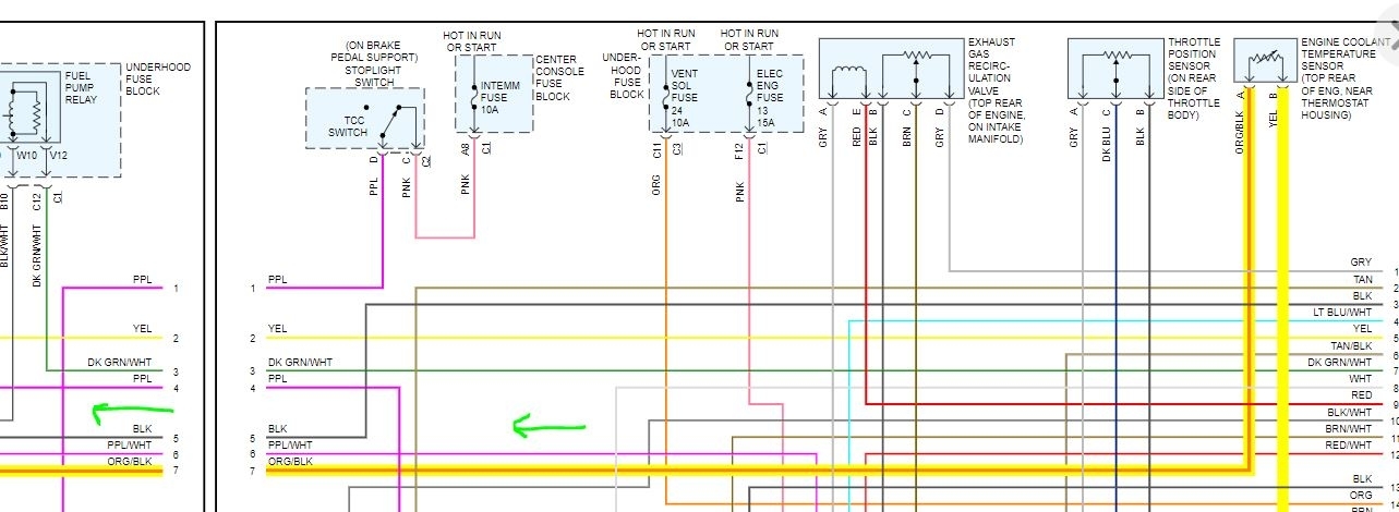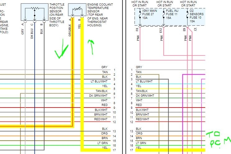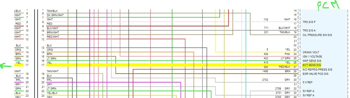 I realize this is a lot, but since they won't run based on the ECT sensor's request, something in this has failed. Please keep in mind, it could be something as simple as a loose connection at the PCM or even corrosion or a pulled pin in the harness. However, I have a feeling that you may find an issue at the splice indicated.
