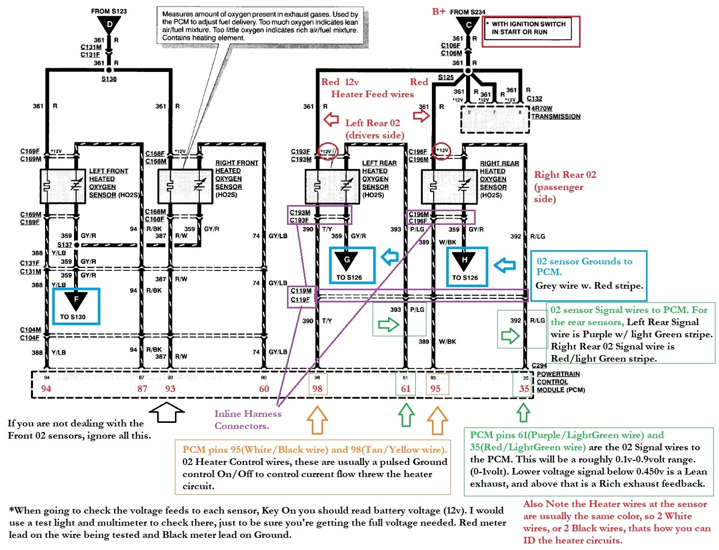These are the OEM Ford wiring diagrams, it looks like the aftermarket ones may be incorrect which is common on older service info. Hopefully there isn'tt too much going on in diagram 1 below, but it's actually very basic, each rear 02 will have 2 wires the same color at the sensor and those will be the heater circuit, but I would do all wire repairs before turning the key on, so no fuses pop. You can check the wiring at each 02 connector for any shorts to ground or continuity to the PCM connector using a multimeter set to read resistance (Ohms), you may know this stuff already, if so just let me know and I won't post so much information.