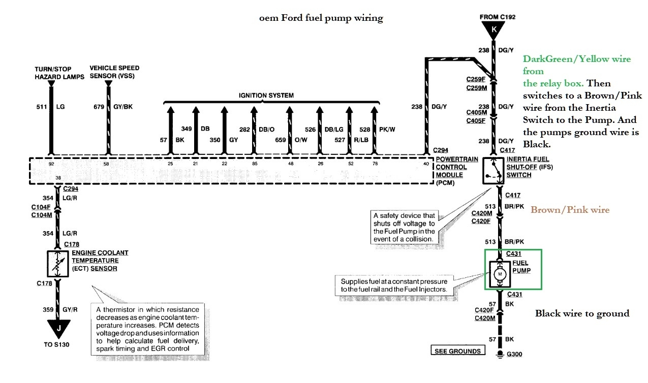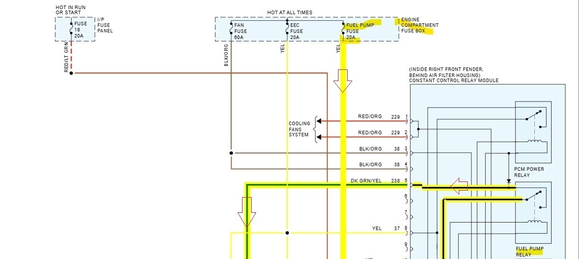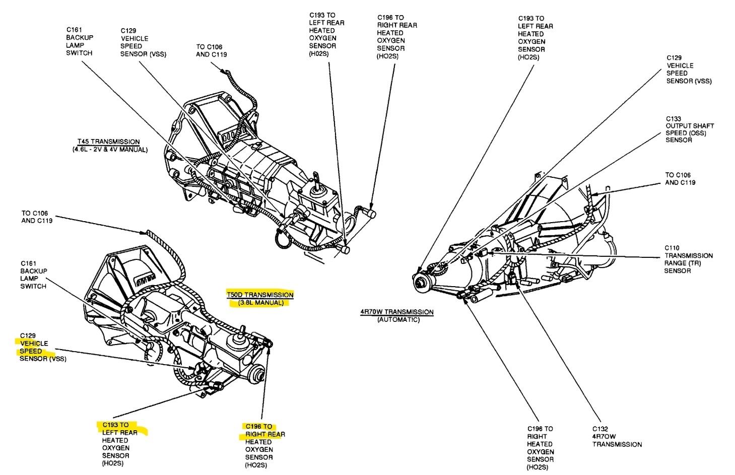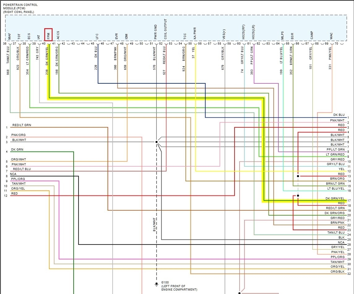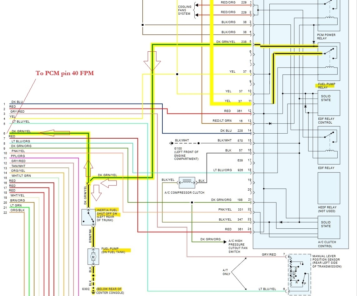 The transmission diagram shows where the 02's harness runs to, along with the vehicle speed sensor. I'm not sure how much around the transmission was damaged but just let us know what you need next. I see the fuel pump power comes from the fuel pump relay to the fuel shut off switch (Inertia switch), it branches off to the PCM from that point as well, so if the fuel pump relay does not activate, the PCM will see power missing on that circuit and can set a code for the fuel pump relay. I will post that next.