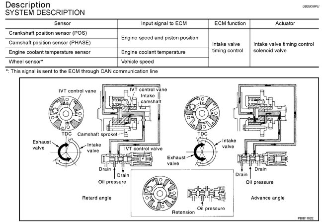 The ECM receives signals such as crankshaft position, camshaft position, engine speed, and engine coolant temperature. Then, the ECM sends ON/OFF pulse duty signals to the intake valve timing control solenoid valve depending on driving status. This makes it possible to control the shut/open timing of the intake valve to increase engine torque in low/mid speed range and output in high-speed range.