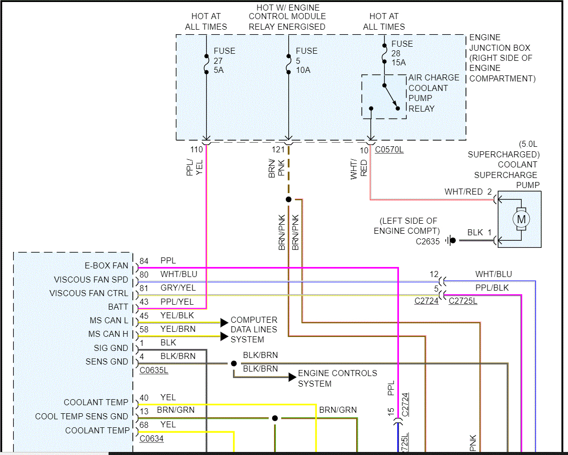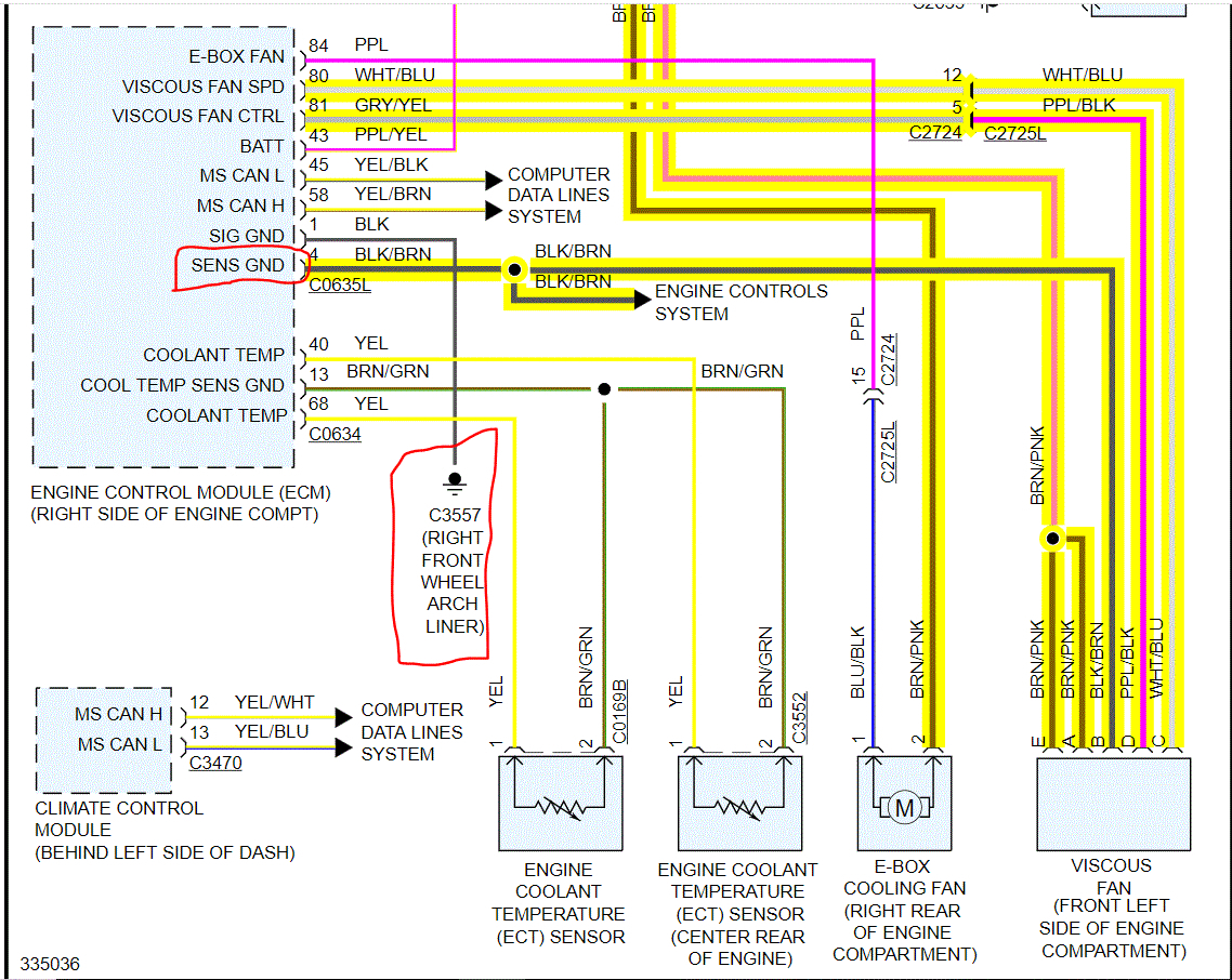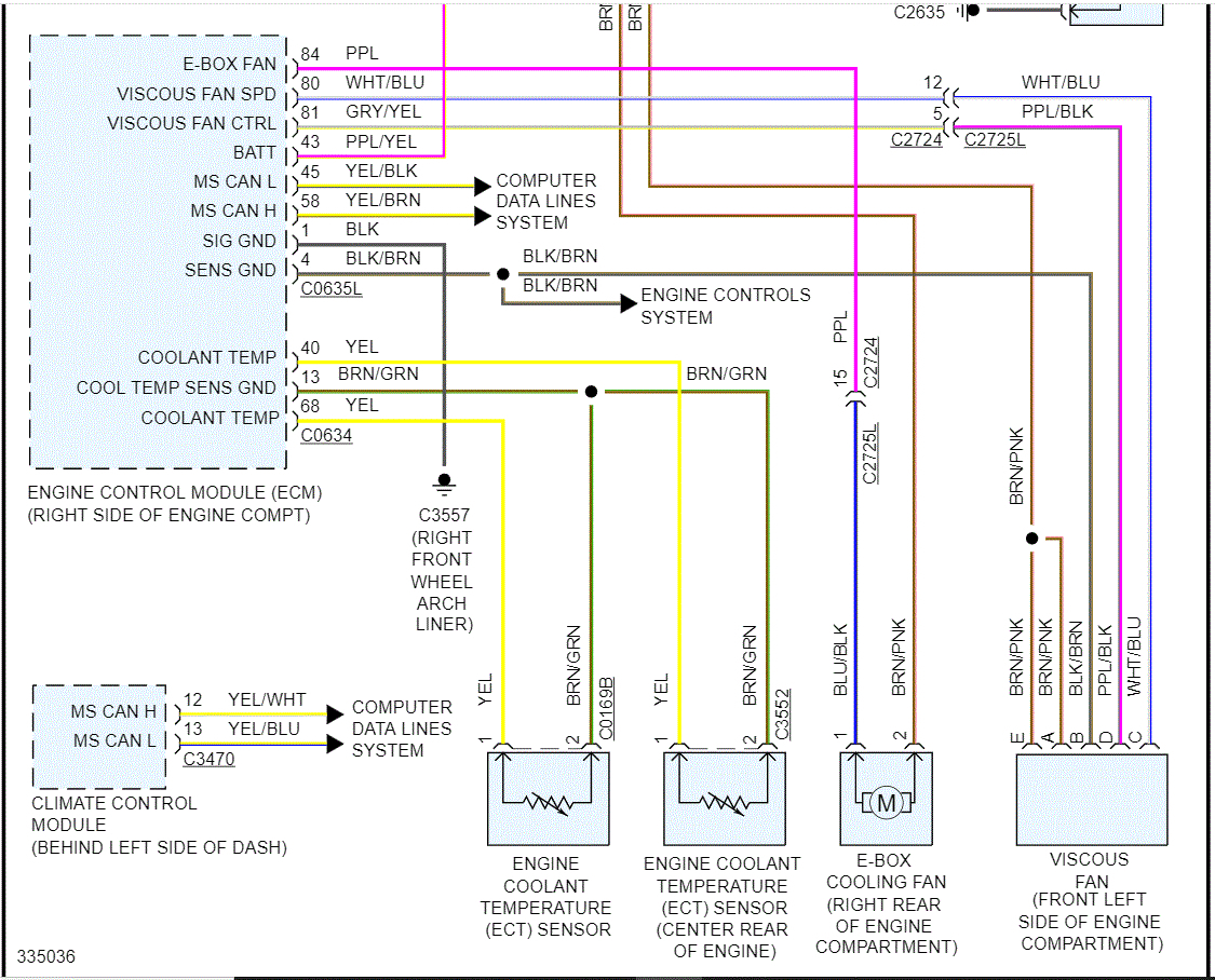 The fan is electronically controlled, so there could be an issue with the ECM. The ECM (engine control module), has an internal temperature sensor and controls the operation of the cooling fan. While the ignition is on, the cooling fan receives a power supply from the ECM relay in the engine junction box. When cooling is required, the ECM connects the cooling fan to ground. So, we can check it to see if the ECM is the issue or if it is a wiring issue.