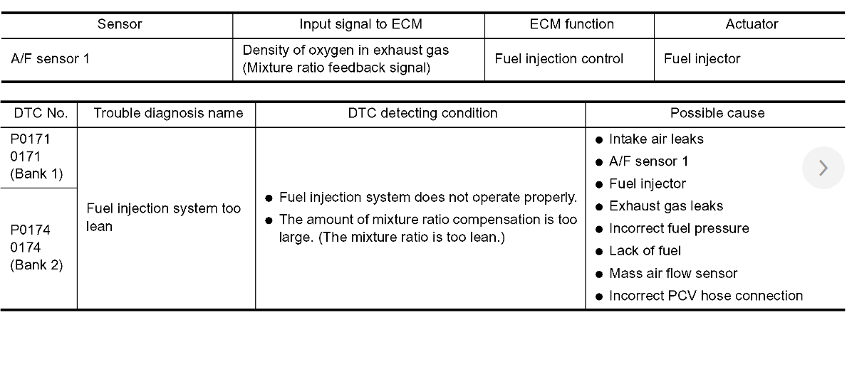 My car is showing codes P0300 random misfire P0171 and P0174 (fuel trim Bank 1 and Bank 2 mixture too lean) I know what the P0300 code is (either a spark plug, or one of the engine coils, but I don't know or understand what the P0171 and P0174 are.
