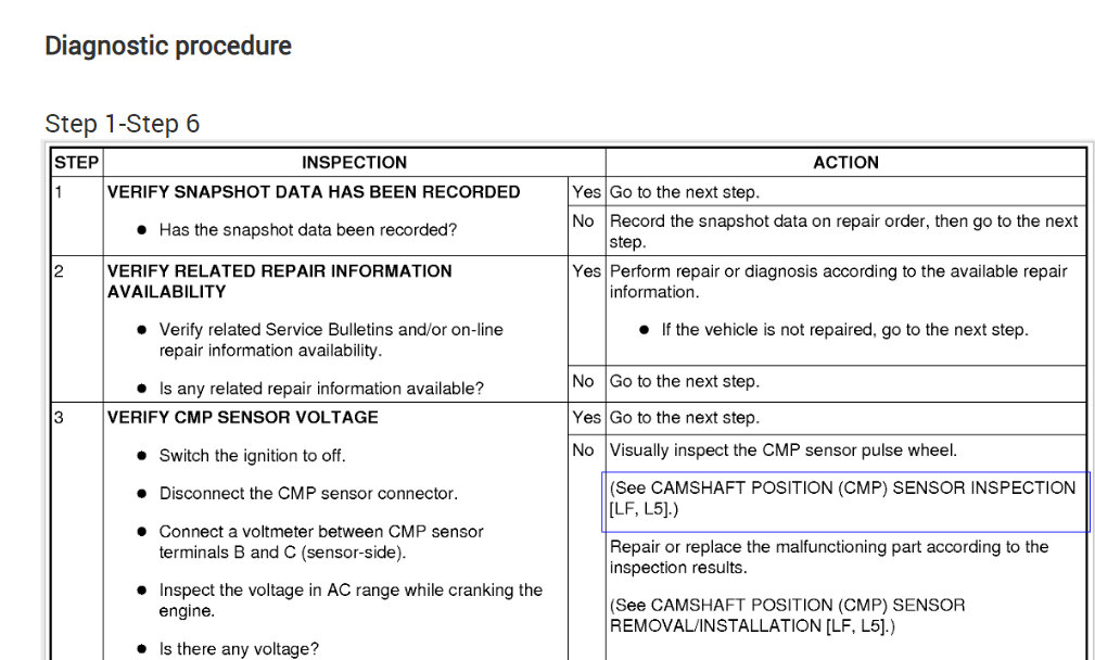 Check CMP sensor on the bench to confirm output behaviour is supposed to be less than 1v pk to pk;