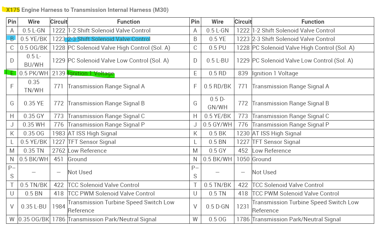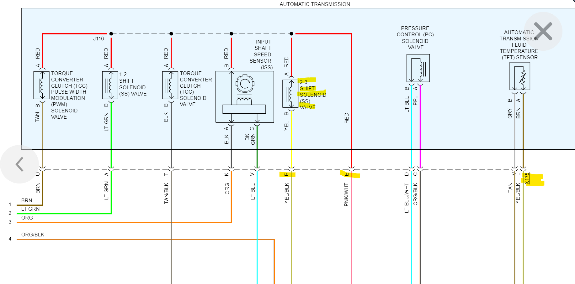 Hello, there's a couple transmissions listed for this vehicle, is the code you're getting P0976 actually say 2-3 shift solenoid? I'll post the diagrams for that setup. and the connector for testing, the code criteria states "Open circuit", so it might be the solenoid is open internally. But testing should be pretty easy. When testing this solenoid, with the Key On engine Off, you should be able to read battery voltage (12v) on the yellow/black wire coming back through the solenoid. The Battery feed is the Pink/White wire, but at just Key On, the circuit won't be pulled to ground yet, so there should be that 12volts coming through the solenoid on the control wire (yellow/black). Or you can unplug the connector and check the resistance for an open circuit inside the solenoid. But check for power is a faster way to verify the entire circuit, at least all the way to the control wire. You could even go so far as to verify it at the TCM if the resistance test is okay.