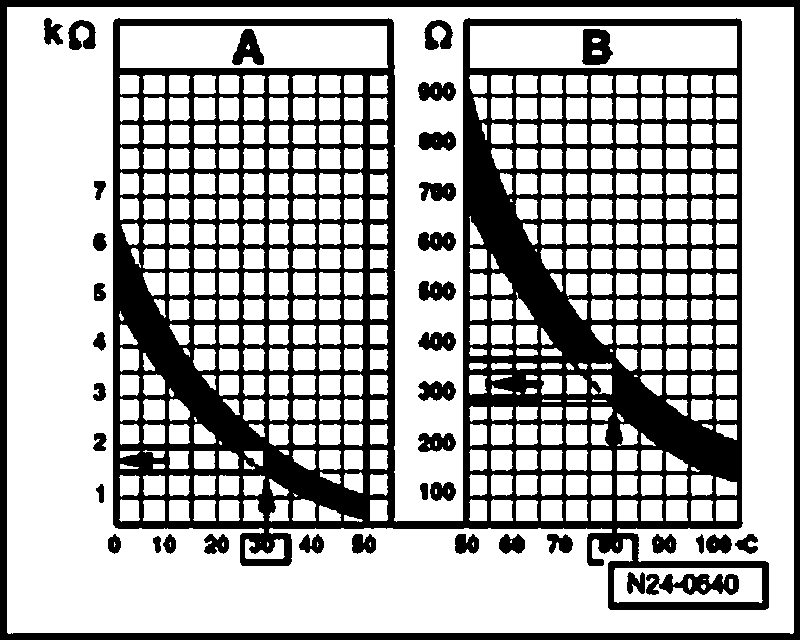 - 30 degrees C is in range A and corresponds to a resistance of 1.5 to 2.0 kilo Ohms