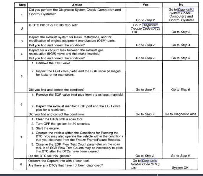 Excessive back pressure in the exhaust system may cause this DTC to set. This condition can cause low engine vacuum and thus can cause a less than expected MAP changes during the EGR flow test. Possible causes of this could be a restriction in the exhaust system or non original equipment manufacture (OEM) exhaust parts.