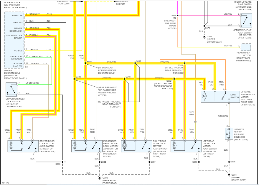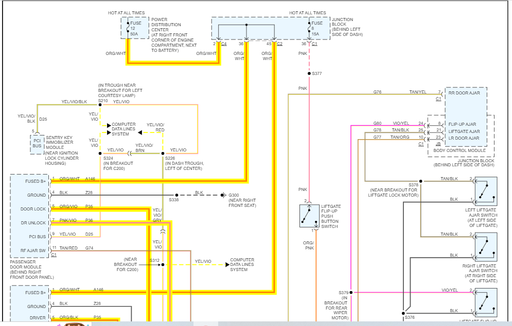 I attached the wiring schematics below so you can reference them. Note there are three wires at each lock actuator. The one I didn't highlight is the door ajar switch. The actuator either locks or unlocks based on polarity. If you send the power in one direction, it locks and the opposite.