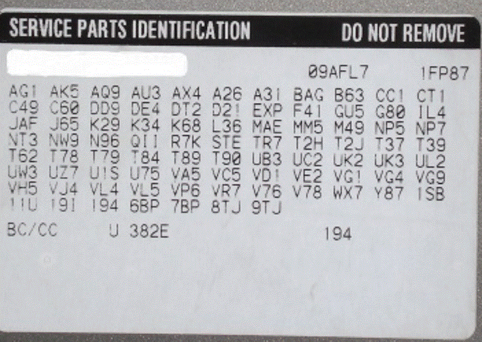Also, if you can, take a pic of the fuse box so I can see it. I can try to make a few comparisons for you. Also, here is a link where you can put the truck's VIN number in, and it will help decode what the vehicle came with. With GM and Chrysler, they have RPO numbers that are very specific. I don't think Ford is the same. But if it is, there should be a label in the glove box that looks similar to the pic I attached below. I found that example online. You can check under the hood as well for the label.