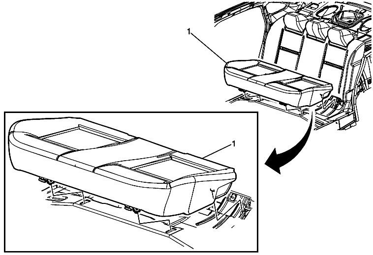 1. Pull up on front of seat cushion to disengage retainers and lift rear seat cushion (1) out of vehicle, Fig. 3. A high amount of upward force will be required.