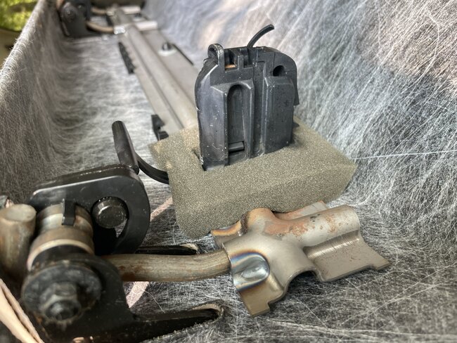 I am trying to remove the front cable. It is pedal actuated. Cable runs under the carpet along the front and rear rocker panels on the left side.