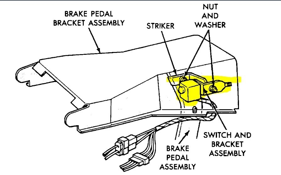 Next, at the top of the brake pedal is a brake light switch. I need you to check it for both adjustment and make sure it isn't disconnected. I attached a pic below to help identify it.