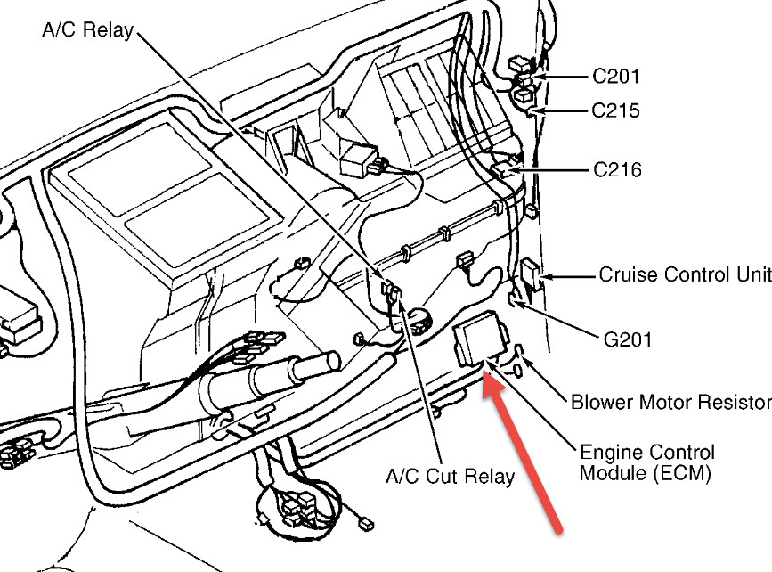 See picture for location under carpet under dash. If replacing it will need to be programmed by a mechanic for security system in order to start car.