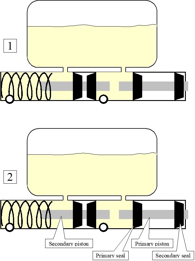 The important parts are listed in the second drawing. The primary piston is the one pushed on by the brake pedal through a push rod and / or power booster assembly. The primary and the secondary pistons each have a primary and a secondary rubber lip seal.