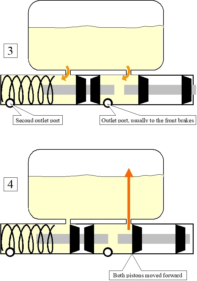 The pistons are still at rest in the third drawing. The orange arrows show where brake fluid runs into the cylinder bore through a pair of "replenishing" ports. They're also called the "return" ports where the brake fluid returning from the wheels flows back up into the reservoir. If a bleeder screw at a wheel is opened, gravity can draw brake fluid down through the replenishing port, through the chamber ahead of the primary piston, then out the port and down to the wheel. Gravity-bleeding is the best way to bleed brakes, but it takes the most time.