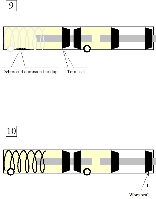 Drawing nine shows a common failure that is easy to prevent. Most brake systems will work fine for many years before a problem develops. In that time, the brake pedal never travels more than halfway to the floor. The pistons and seals in the master cylinder travel back and forth in the upper halves of their bores. Thanks in part to the moisture that sneaks in, crud and corrosion develops in those areas where the seals don't normally run. At some point a leak will develop, then the pistons travel further and a seal gets run over that crud. That can rip the seal resulting in a slowly-sinking brake pedal. That often takes two or three days to show up. This is internal leakage inside the master cylinder. No brake fluid is lost, but none gets pushed down to the two wheels in that half of the system.