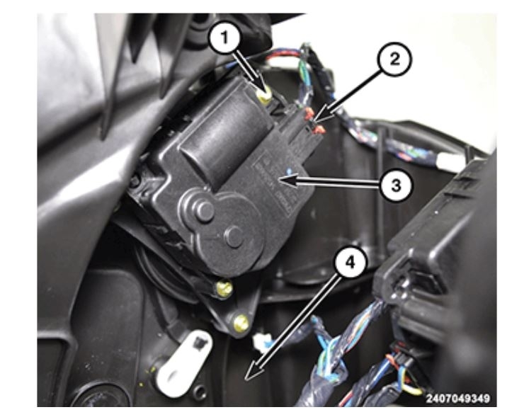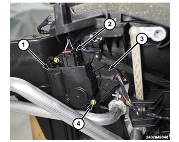 Remove the two screws (1) that secure the blend door actuator (3) to the right side of the HVAC air distribution housing (4).