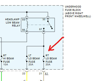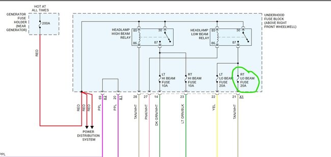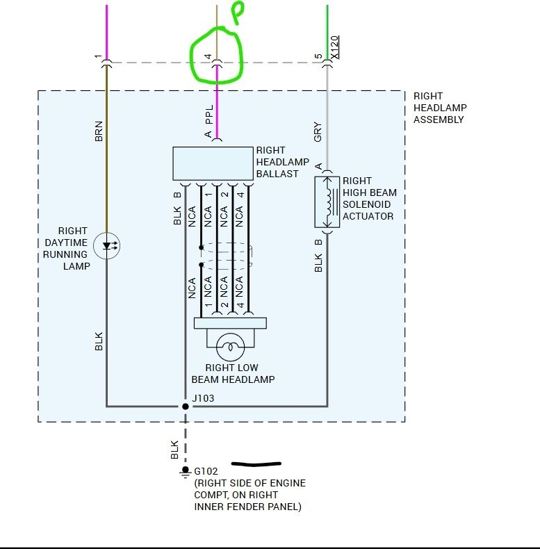 As you say it is only the right side that is out then the first place to look would be the fuse for that bulb. That fuse is in the fuse box under the hood labeled as low beam right. That gets power from the low beam relay. The feed from the relay splits to feed both front bulbs. As you still have the left side light and the high beam isn't a bulb but just a shutter that fuse is the starting point. It then feeds power out on the Tan with white stripe wire to the bulb. The lamp assembly has a ground wire to take care of all the pieces. Testing isn't difficult. Go to the fuse box with a test light. Connect to a ground and then test the fuse on both ends, visual may not tell you there is a problem. If the fuse tests good then you need to unplug the lamp assy. Turn the lights on high beam. Then use the test light to probe for power. The Light Green, Tan/white and Purple should all show power. If they do then test the black wire for ground, use a pin to touch the power from one of the wires, then check the Black wire. If it lights the circuits all test good. I suspect that there is either a bad fuse or the tan wire or connectors has a problem where it feeds the bulb.