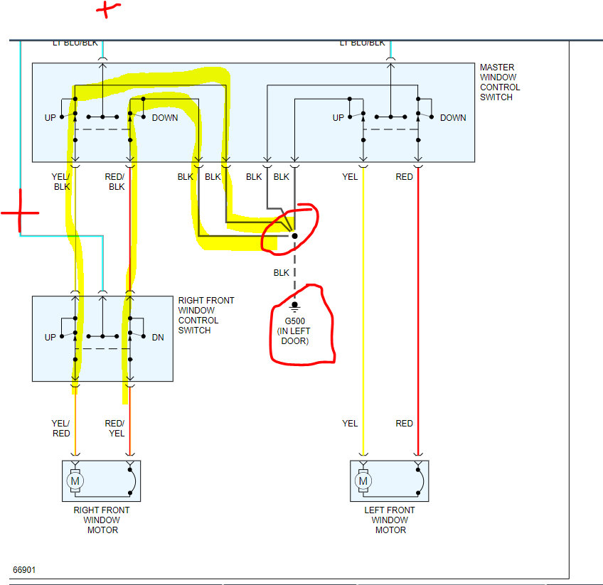 Let me know if that helps. Also, if you need help understanding what I said (I tried) LOL, let me know. What makes this confusing is the idea that power is always at the switches. What determines what a window motor does is based on the ground wire that is selected.