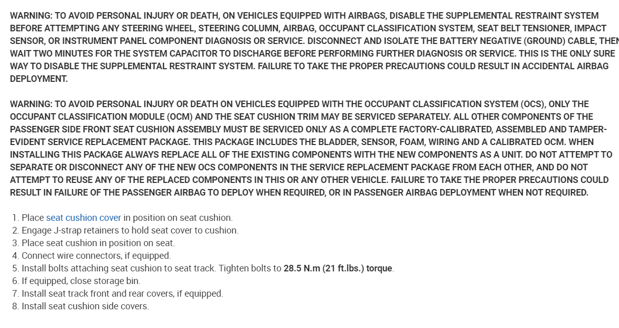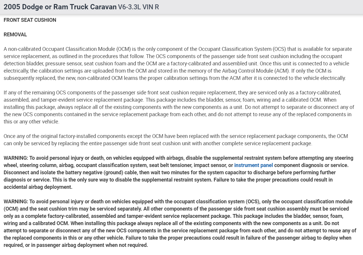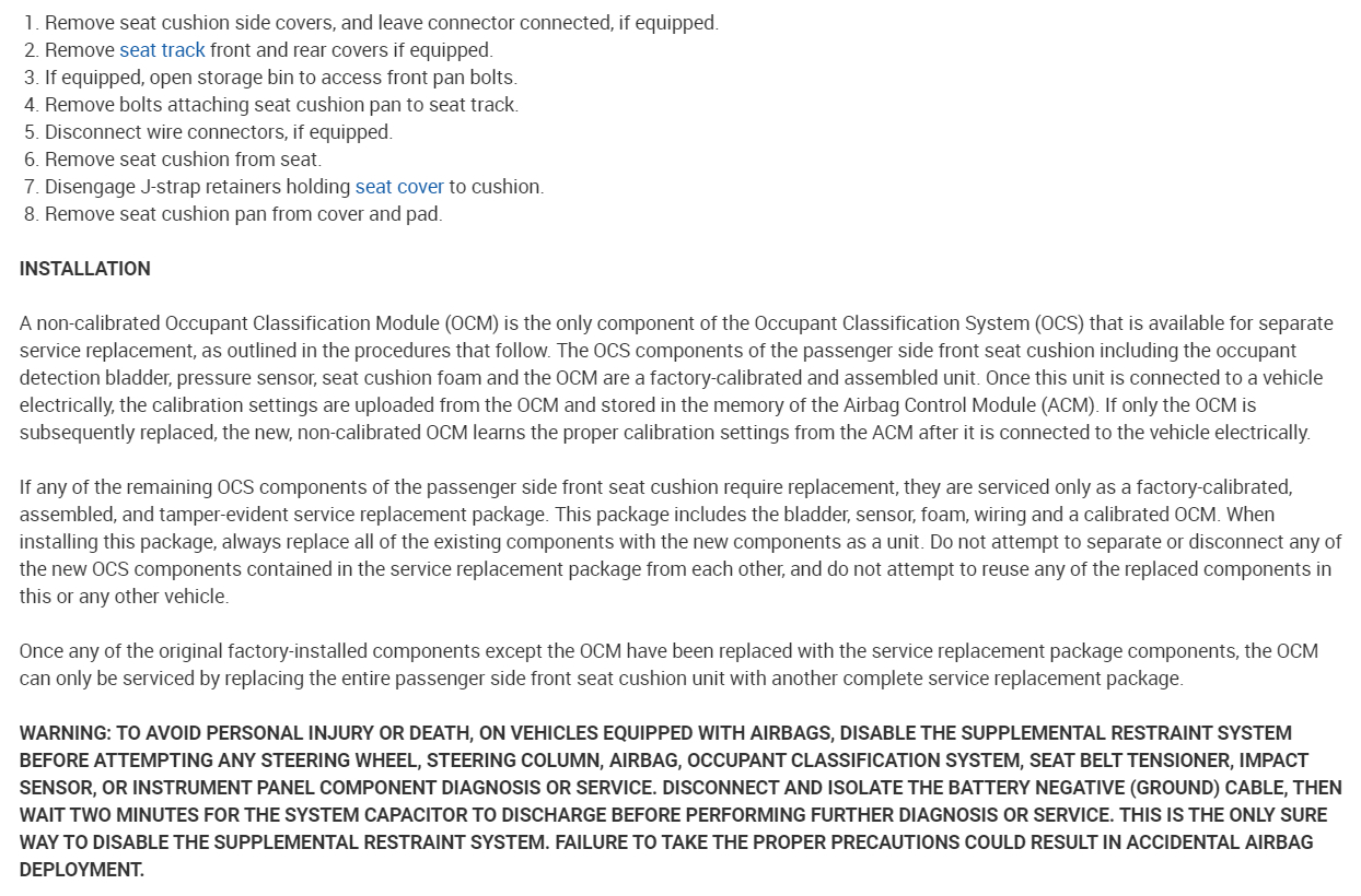 Vehicles equipped with the Occupant Classification System (OCS) have a seat weight bladder and pressure sensor unit that is integral to the passenger front seat cushion. The pressure sensor receives a nominal five volts and a ground through dedicated hardwired circuits from the OCM. The OCM then monitors the pressure sensor output voltage. Check out the images (below). Please let us know what happens.
