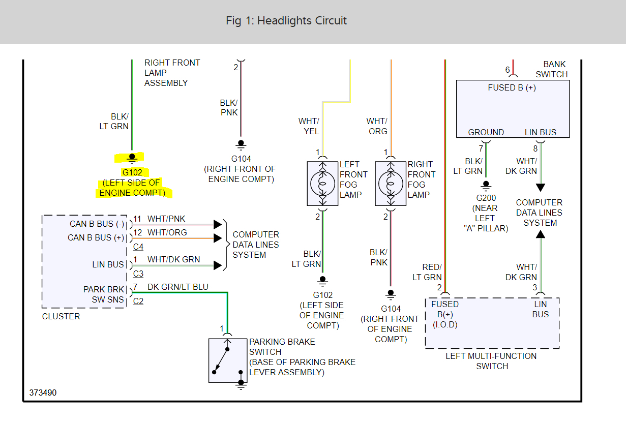 The headlamp system includes the SCM, the EMIC, the TIPM, and the left (lighting) multi-function switch on the steering column. The headlamp bulbs have a path to ground at all times through their connection to the engine compartment wire harness. The engine compartment harness has takeouts with eyelet terminals that are secured by nuts to ground studs on the front end sheet metal within the engine compartment. The TIPM will store a Diagnostic Trouble Code (DTC) for any shorts or opens in the headlamp circuits.