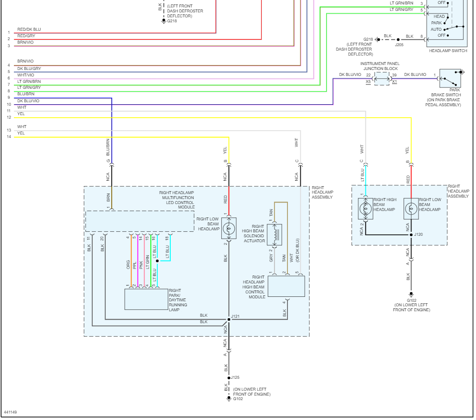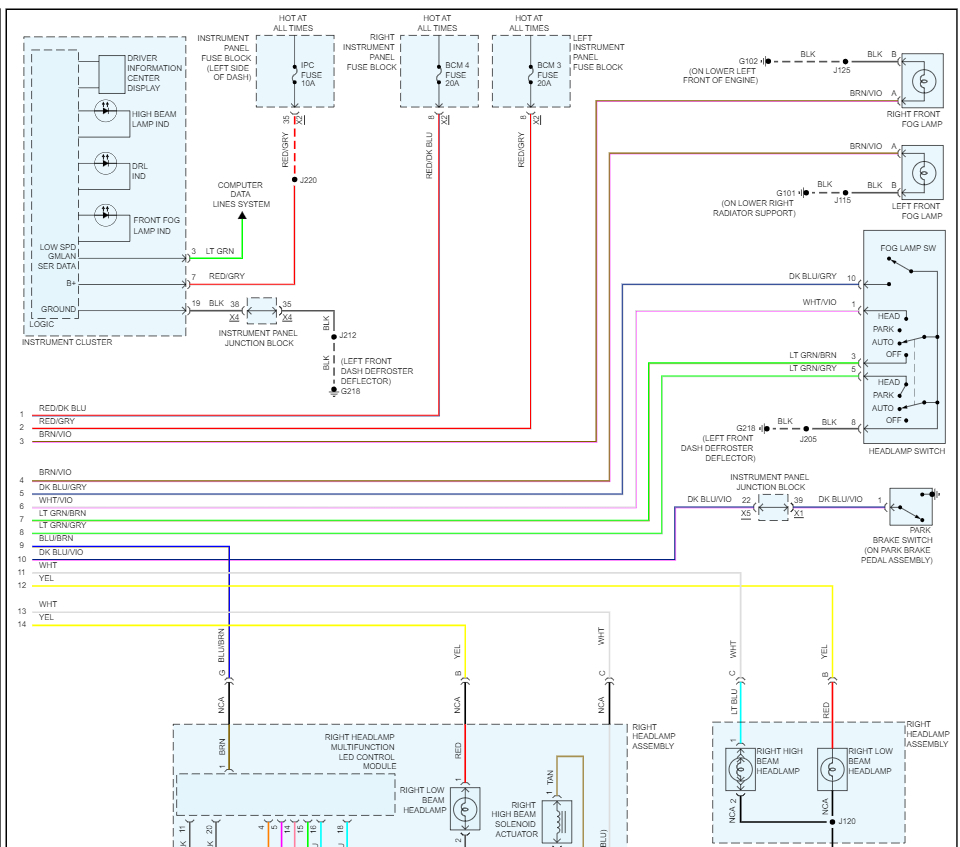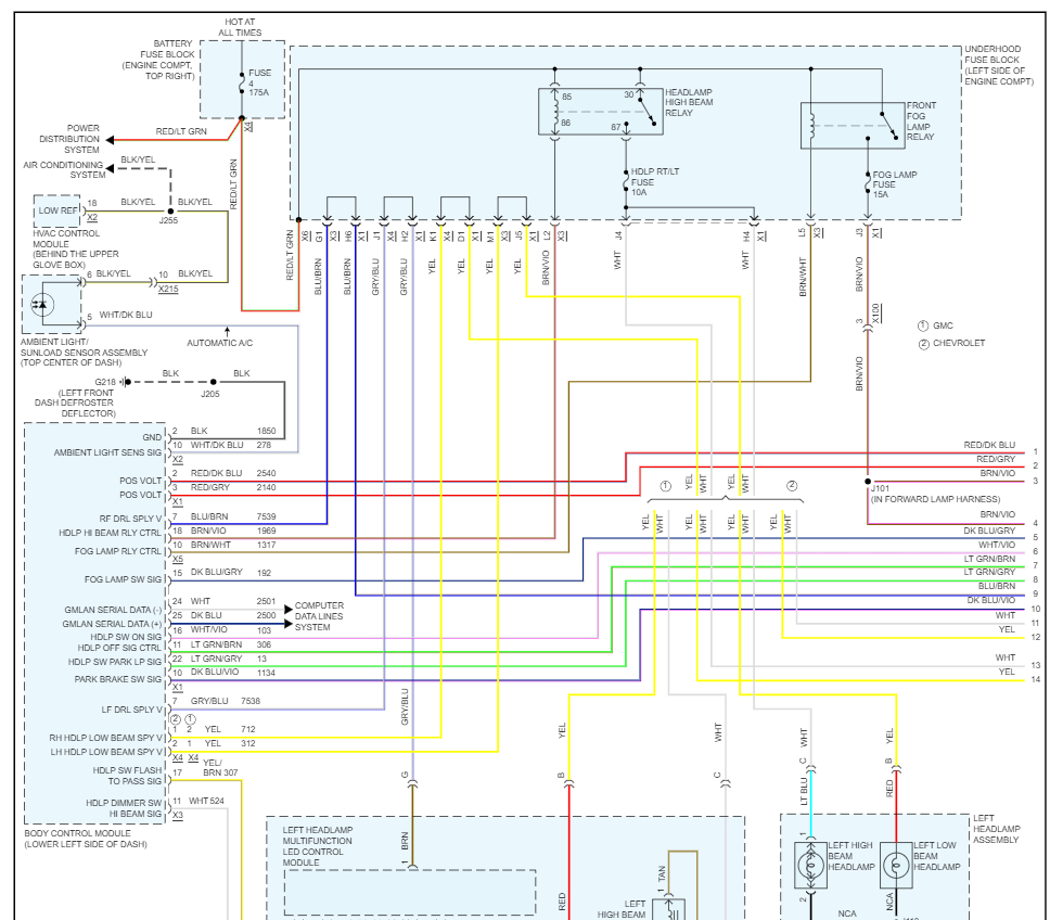 I have the truck listed above Silverado WT. The passenger side low beam headlight does not come on. The other headlights are all working. The bulb tests good. When the headlights are supposed to be on (verified by observing the driver's side low beam being on), I read 3.5 Volts at the red wire connector going to the passenger low beam. Since the passenger high beam is working and since the low beam and high beam share the same frame ground, it is assumed this is not a ground problem. This is verified by measuring the same 3.5 volts from the red wire to the frame. I have the headlight schematic. It shows the right hand (passenger) and left hand (driver) low beam power supply coming out of the BCM on yellow wires marked 712 and 312 respectively. I would like to measure the output of the BCM on these wires, but they are part of a tight wire bundle. So, according to the schematic, the next measurement point is in the main under-hood fuse block. The passenger side low beam yellow wire 712 comes into the fuse block at "K1 X4" and comes out on "D1 X1". There does not seem to be a fuse associated with this for some reason (no low beam fuse is mentioned on the fuse box map on the underside of the fuse block lid and the "headlamps" fuse is high beams only). So I need to know 1) is there a fuse in the main fuse block for the low beams, 2) if not why did they route these yellow wires from the BCM to the fuse block, and 3) if there is no under-hood fuse because it relies on F6DL (which tests good and which has 12 volts), where is the passenger low beam power wire input location in the main fuse block designated by K1, X4 on the schematic, and where on the fuse block is the output designated by D1, X1 on the schematic? Also, are BCMs common root cause of low voltage at headlight or something else?
