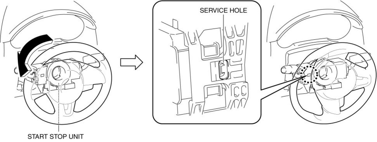 3. Rotate the steering wheel until the service hole in the position shown in the figure is visible.