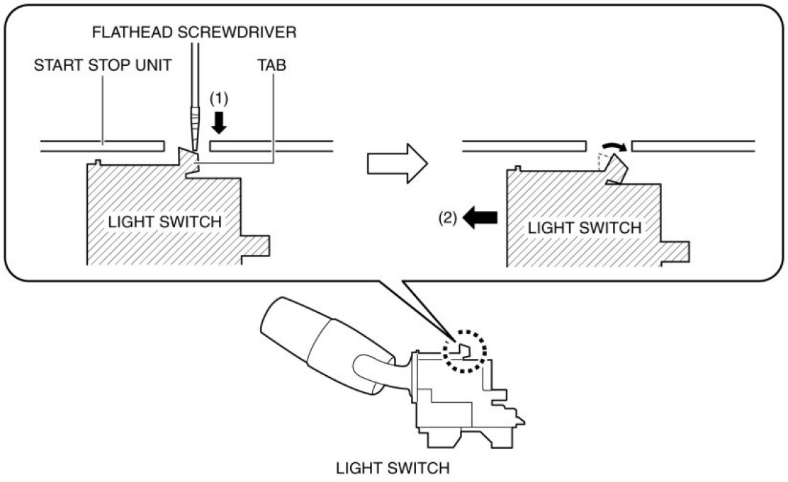 5. While pressing the light switch tab in the direction of the arrow (1) shown in the figure using a flathead screwdriver, pull out the light switch in the direction of the arrow (2) shown in the figure to detach the light switch tab from the start stop unit.