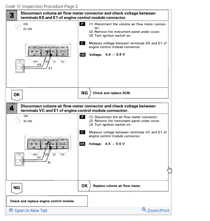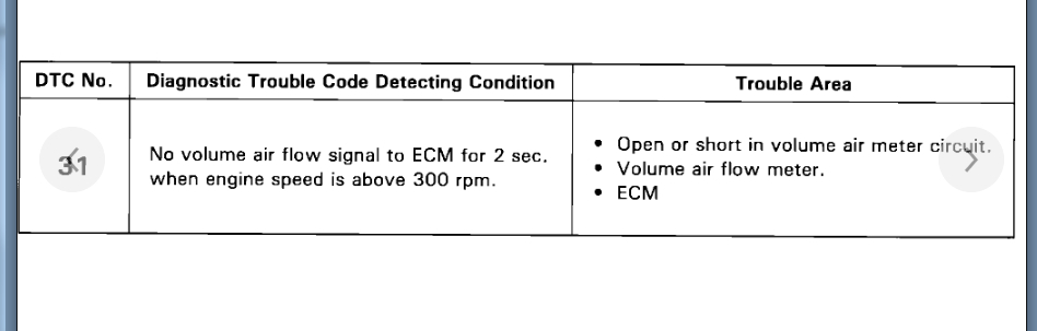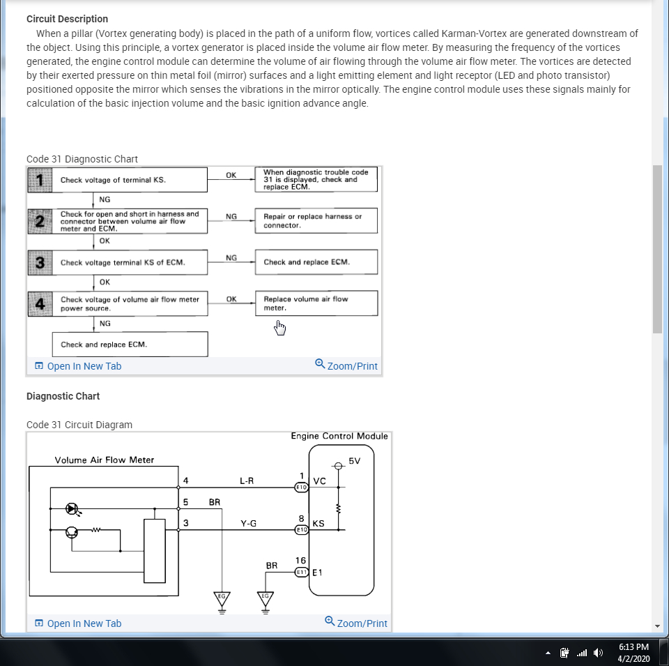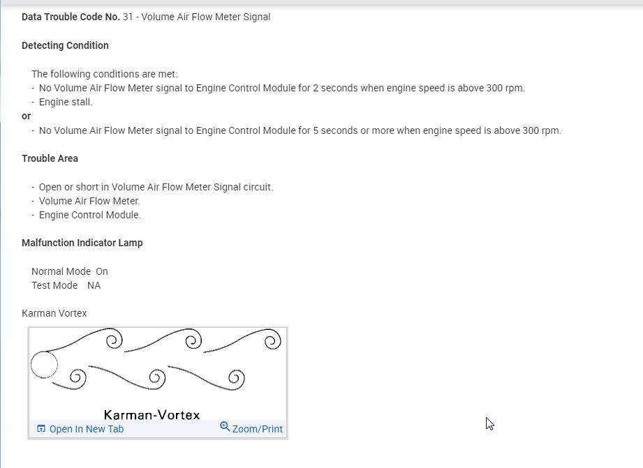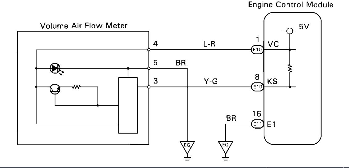 When a pillar (Vortex generating body) is placed in the path of a uniform flow, vortices called Karman-Vortex are generated downstream of the object. Using this principle, a vortex generator is placed inside the volume air flow meter. By measuring the frequency of the vortices generated, the engine control module can determine the volume of air flowing through the volume air flow meter. The vortices are detected by their exerted pressure on thin metal foil (mirror) surfaces and a light emitting element and light receptor (LED and photo transistor) positioned opposite the mirror which senses the vibrations in the mirror optically. The engine control module uses these signals mainly for calculation of the basic injection volume and the basic ignition advance angle.