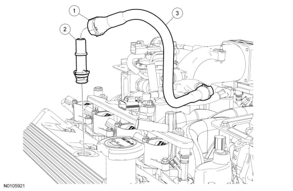 1. Disconnect the crankcase ventilation tube-to-PCV valve quick connect coupling and position the tube aside. For additional information, refer to Fuel System - General Information See: Fuel Line Coupler > Removal and Replacement.