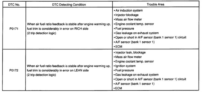 - When the DTC P0171 is recorded, the actual air-fuel ratio is on the LEAN side. When DTC P0172 is recorded, the actual air-fuel ratio is on the RICH side.
