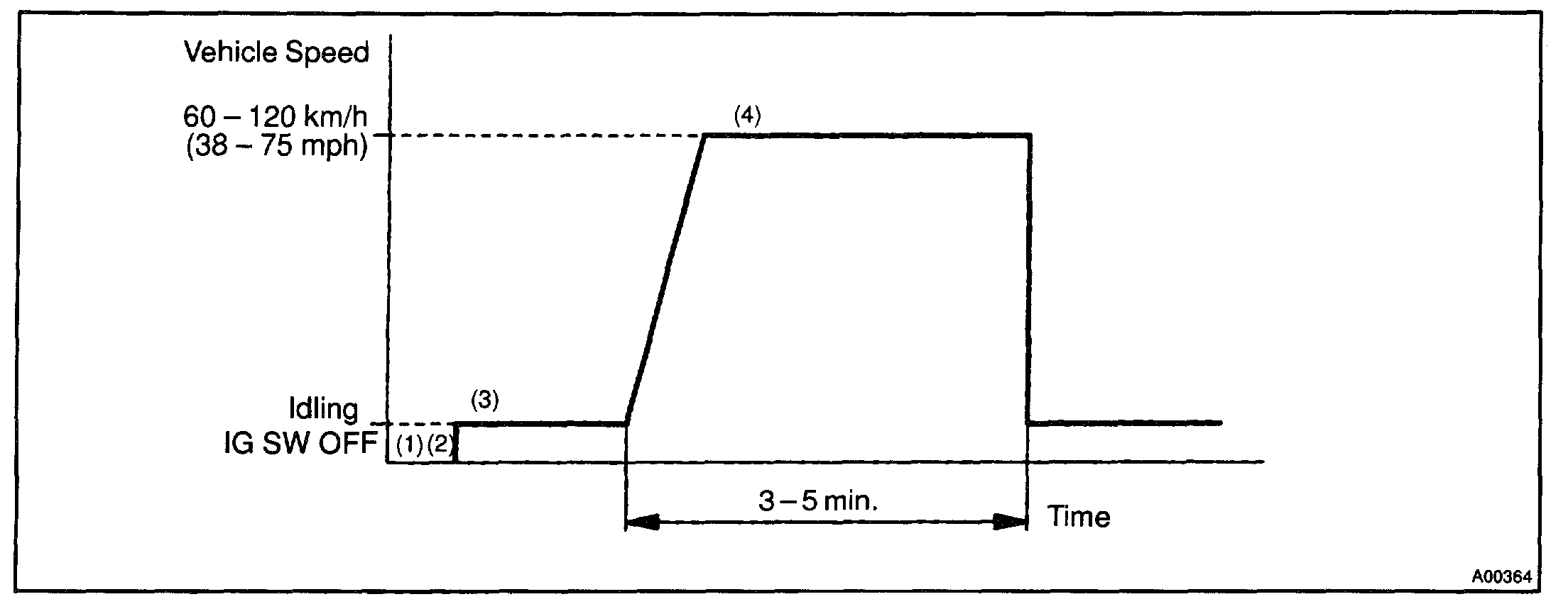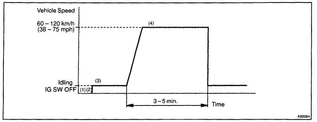 4. Drive the vehicle at 60 - 120 km/h (38 - 75 mph) and the engine speed at 1,600 - 3,200 rpm for 3 - 5 min.