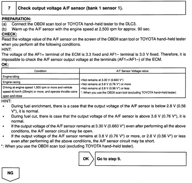 - The ECM controls the voltage of the AF1 - and AF1 - terminals of the ECM to the fixed voltage. Therefore, it is impossible to confirm the A/F sensor output voltage without OBD II scan tool or TOYOTA hand-held tester.