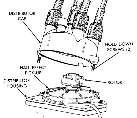 When this pick-up assembly fails, it stops sending signal pulses to the Engine Computer. Those pulses are what tells the computer the engine is rotating, (cranking or running), and it's time to turn on the automatic shutdown, (ASD) relay. That relay sends current to the ignition coil, injector(s), alternator field, and fuel pump or separate fuel pump relay. The common mistake too many people make is they try to repair the circuit for the first thing they find missing, rather than looking for other things the failure has in common. Most of the time they find the loss of spark and concentrate on that. In fact, loss of spark only accounts for about two percent of these crank / no-starts, and a dead fuel pump accounts for about three percent. A good 95 percent are caused by the distributor pick-up assembly. Chrysler calls this the "Hall Effect Switch" for the type of switching transistor it uses. You may also find it called the "ignition pick-up coil", "distributor reference sensor", or camshaft position sensor".