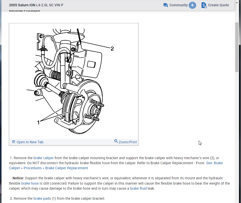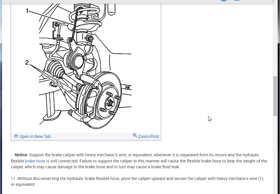 Notice: Support the brake caliper with heavy mechanic's wire, or equivalent, whenever it is separated from its mount and the hydraulic flexible brake hose is still connected. Failure to support the caliper in this manner will cause the flexible brake hose to bear the weight of the caliper, which may cause damage to the brake hose and in turn may cause a brake fluid leak.