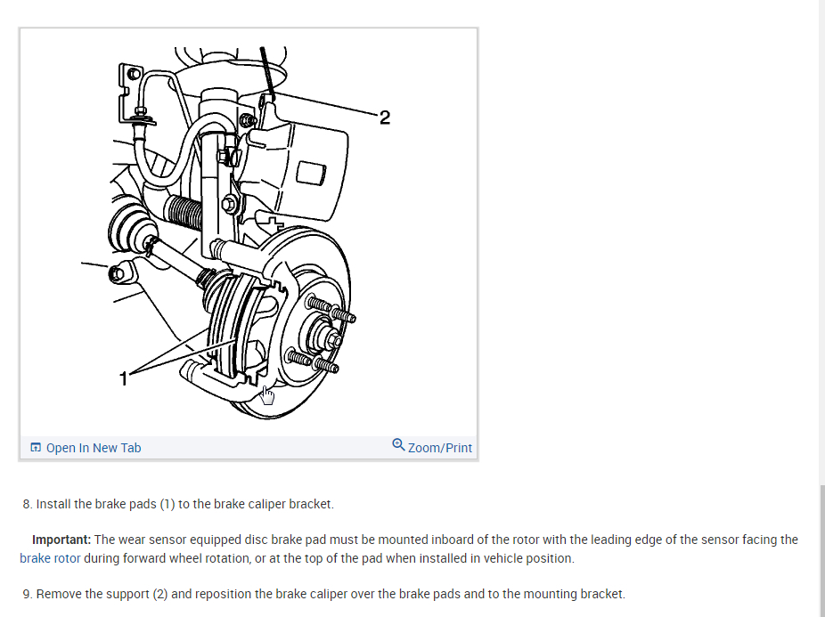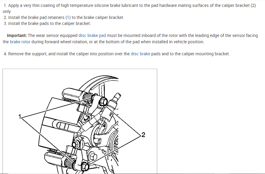 Important: The wear sensor equipped disc brake pad must be mounted inboard of the rotor with the leading edge of the sensor facing the brake rotor during forward wheel rotation, or at the top of the pad when installed in vehicle position.
