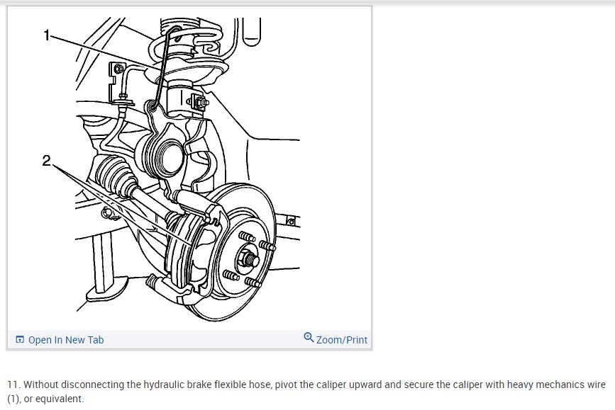 11. Without disconnecting the hydraulic brake flexible hose, pivot the caliper upward and secure the caliper with heavy mechanics wire (1), or equivalent.