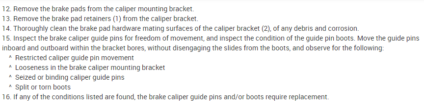 16. If any of the conditions listed are found, the brake caliper guide pins and/or boots require replacement.