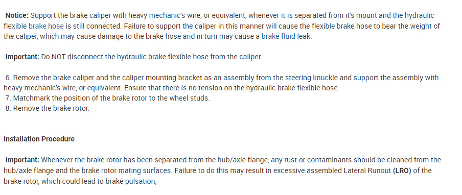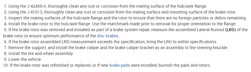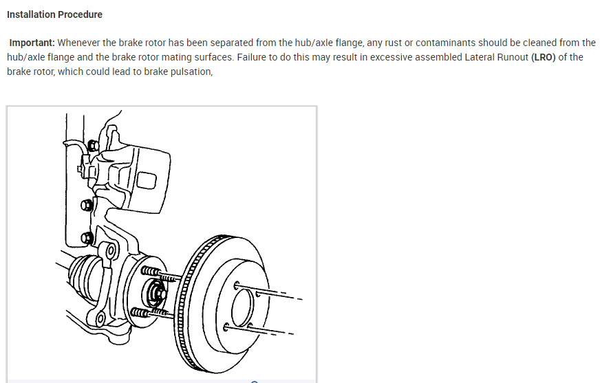 Important: Whenever the brake rotor has been separated from the hub/axle flange, any rust or contaminants should be cleaned from the hub/axle flange and the brake rotor mating surfaces. Failure to do this may result in excessive assembled lateral runout (LRO) of the brake rotor, which could lead to brake pulsation.