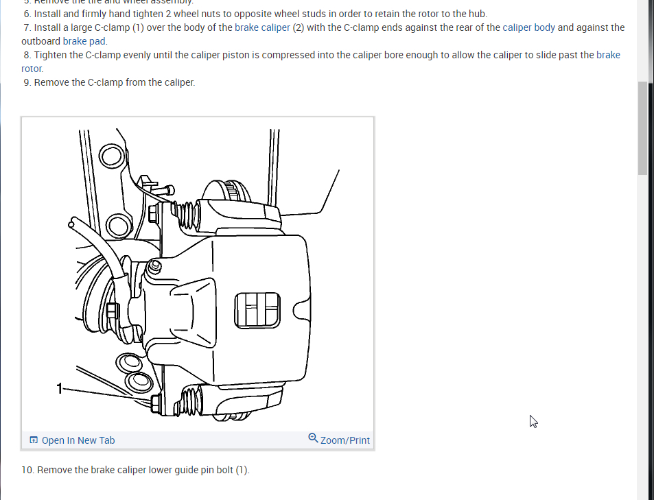 8. Tighten the C-clamp evenly until the caliper piston is compressed into the caliper bore enough to allow the caliper to slide past the brake rotor.