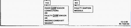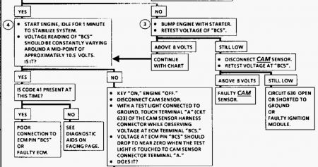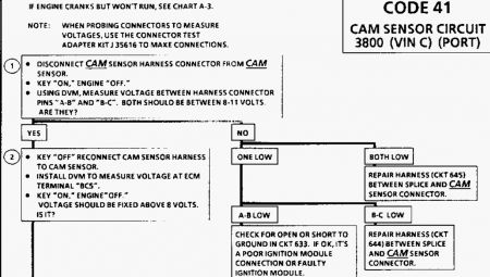 CODE 41, CAM SENSOR CIRCUIT Quick reference: See Fig. 45 for Code 41 flow chart. " See Fig. 44 for Code 41 supplemental wiring. " All Updated Information All the Code 41 information here (including the flow chart) has been updated as per the General Motors Technical Service Bulletins (TSBs) listed below. All outdated information has been discarded. Buick 91-6E-14 " Oldsmobile 91-T-45 " Pontiac 91-6-18 " Circuit Description The 3800 engine uses the simultaneous mode of fuel injection during start-up. As the engine speed attains the 400 RPM level and a cam signal has been received by the ECM from C3I module, the fuel injection switches modes to sequential injection. This is accomplished by use of a cam interrupter magnet and a cam sensor "Hall Effect" switch. The cam sensor sends a signal (sync-pulse) to the ignition module when cylinder #1 is 25 ° after top dead center on the compression stroke. This signal is used to start sequential fuel injection with the proper cylinder. If cam signal is lost to the ECM, the fuel delivery will switch back to the simultaneous mode of injection. THE ENGINE WILL CONTINUE TO RUN. IT WILL RESTART AFTER SHUT DOWN. Code 41 is set when the following conditions are met: Engine is running. " Cam sensor signal not received by the ECM in last 2 seconds. " Test Description The numbers below refer to the circled numbers in the diagnostic flow chart. This step verifies proper operation of circuits 633, 644, and 645. See Fig. 44 for circuit identification. 1. Step validates the integrity of Circuit 630 from the ignition module to the ECM. See Fig. 45 for circuit identification. 2. If the camshaft gear magnet is interfacing with the cam sensor the voltage reading will be zero, bumping engine will cause the condition to go away. 3. If the voltage reading of terminal "BC5" is constantly varying and connection to terminal "BC5" are good, the ECM is faulty. 4. V The magnet or gear may be damaged, Posted By: PCS agent 6 Flag Post For Monitor Review